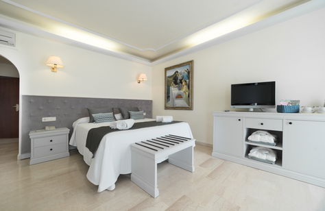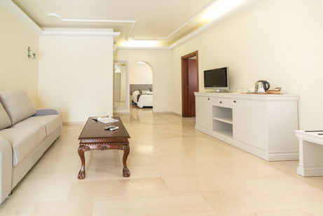 Disfruta de nuestra Suite, a solo unos pasos de la playa. Con aire acondicionado, Wi-Fi gratuito, TV y balcón privado, esta amplia habitación combina la zona de estar y el salón en un solo espacio sin puertas de separación. Relájate en el sofá, aprovecha el minibar y la caja fuerte, y disfruta de un baño completo con secador de pelo y albornoz. ¡Una opción perfecta para una estancia cómoda y exclusiva!
